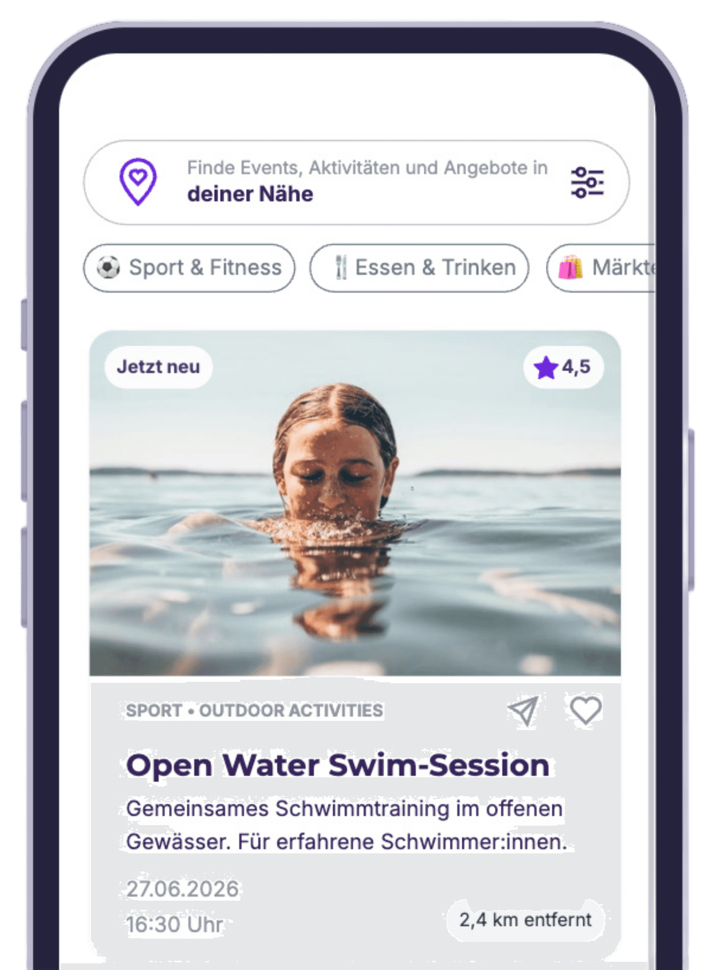 Weniger Streuverlust und mehr relevante Reichweite: Deine Angebote und Events erscheinen bei Nutzer:innen in deiner Region, basierend auf Standort, Interessen und Aktivität. Zur richtigen Zeit. Am richtigen Ort.